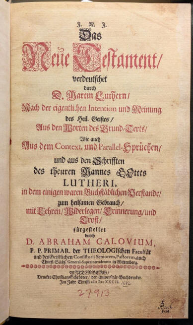 Ever since J.S. Bach’s “Calov Bible” surfaced in Frankenmuth (MI, USA) in 1934, confusion has surrounded this book, both in terms of the physical object and its significance for Bach research. As for the physical object: what is colloquially called the “Calov Bible” or “Bach’s Bible” is, in fact, a biblical commentary, largely excerpted from Luther’s writings and prepared and published in Wittenberg during the years 1681 and 1682 by the seventeenth-century theologian Abraham Calov, who also provided additional exegetical commentary.